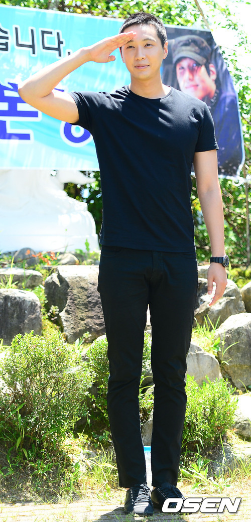 7일 오후 강원도 춘천시 신북읍 102보충대를 통해 현역으로 입대하는 지현우가 입대 전 부대 앞에서 경례를 하고 있다.