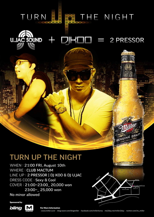 밀러는 10일 밤 9시, 부산 해운대 클럽 막툼(Mactum)에서 DJ KOO와 함께 ‘턴 업 더 나잇(TURN UP THE NIGHT)’ 파티를 개최한다.