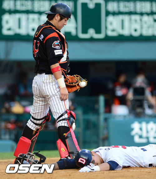 강민호의 팔꿈치는 심각한 상태는 아니고 선수보호 차원에서 빼 준 것이다. 강민호가 빠지며 4번 자리에는 홍성흔이 들어갔고 용덕한을 포수 마스크를 쓰고 8번타자로 출전한다.