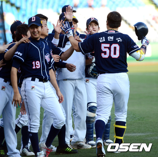 7일 오후 대전구장에서 열린 '2012 팔도 프로야구' 한화 이글스와 두산 베어스의 경기 1회초 2사 김현수가 솔로포를 친 후 덕아웃에서 동료들과 하이파이브를 하고 있다.
