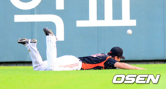 7일 오후 서울 잠실구장에서 열린 2012 팔도 프로야구 LG 트윈스와 롯데 자이언츠의 경기 1회말 2사 2루 LG 정성훈의 선취 1타점 적시타 타구를 롯데 김주찬 좌익수가 놓치고 있다. .