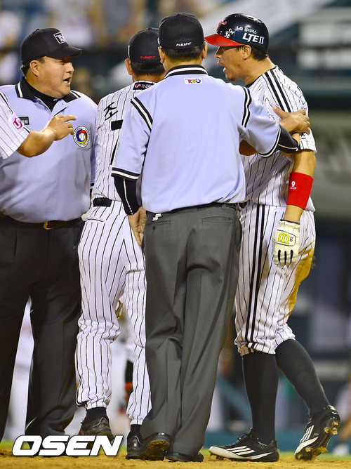 7일 오후 서울 잠실구장에서 열린 2012 팔도 프로야구 LG 트윈스와 롯데 자이언츠의 경기 5회말 2사 만루 LG 이진영의 동점 적시타때 2루 주자 이병규가 롯데 강민호 포수에게 태그아웃됐다. 이병규가 최수원 구심의 판정에 강력하게 어필하고 있다.