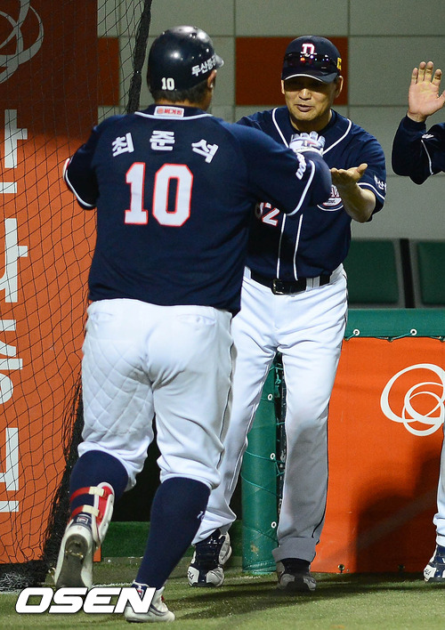 7일 오후 대전구장에서 열린 '2012 팔도 프로야구' 한화 이글스와 두산 베어스의 경기 5회초 무사 1루 최준석이 투런포를 친 후 덕아웃에서 김진욱 감독과 하이파이브를 하고 있다.