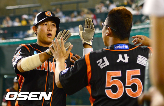 7일 오후 서울 잠실구장에서 열린 2012 팔도 프로야구 LG 트윈스와 롯데 자이언츠의 경기 6회초 1사 2루 롯데 손용석의 1타점 적시타때 2루 주자 황재균이 홈을 밟은 뒤 동료들의 축하를 받고 있다.