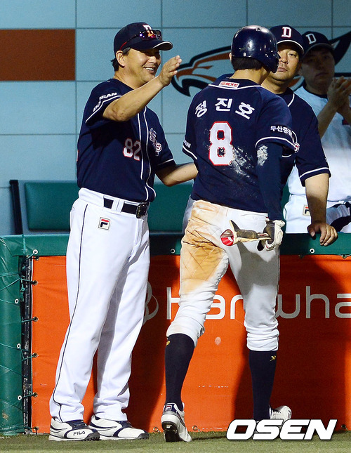 7일 오후 대전구장에서 열린 '2012 팔도 프로야구' 한화 이글스와 두산 베어스의 경기 8회초 1사 1,3루 고영민의 1타점 적시타에 홈을 밟은 3루주자 정진호가 덕아웃에서 김진욱 감독과 하이파이브를 하고 있다.