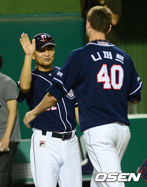 7일 오후 대전구장에서 열린 '2012 팔도 프로야구' 한화 이글스와 두산 베어스의 경기 종료 후 김진욱 감독과 니퍼트가 하이파이브를 하고 있다.
