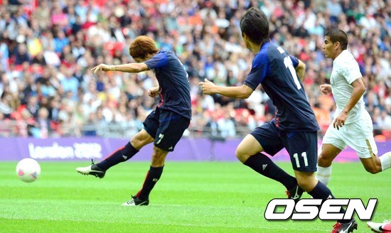 8일(한국시간) 새벽 영국 런던 웸블리 스타디움에서 열린 ‘2012런던올림픽 남자축구’ 일본과 멕시코의 준결승 전반 일본의 오쓰가 강력한 중거리 슛으로 선제골을 넣고 있다.