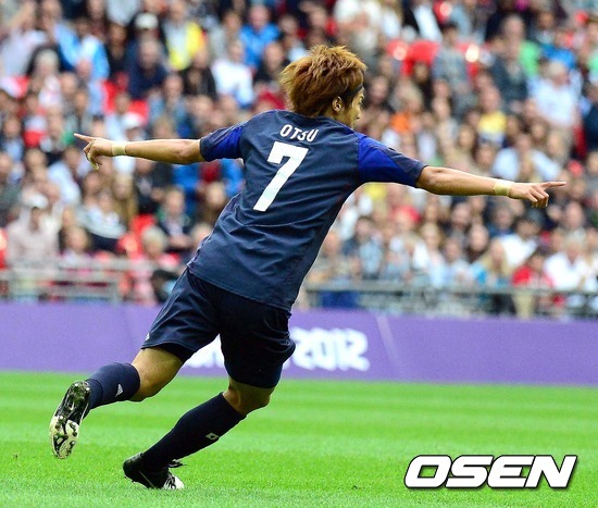 8일(한국시간) 새벽 영국 런던 웸블리 스타디움에서 열린 ‘2012런던올림픽 남자축구’ 일본과 멕시코의 준결승 전반 일본의 오쓰가 강력한 중거리 슛으로 선제골을 넣고 있다.