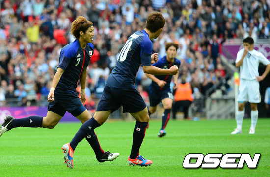 8일(한국시간) 새벽 영국 런던 웸블리 스타디움에서 열린 ‘2012런던올림픽 남자축구’ 일본과 멕시코의 준결승 전반 일본의 오쓰가 강력한 중거리 슛으로 선제골을 넣은 후 기뻐하고 있다.