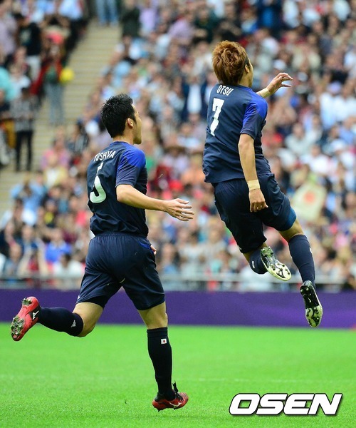 8일(한국시간) 새벽 영국 런던 웸블리 스타디움에서 열린 ‘2012런던올림픽 남자축구’ 일본과 멕시코의 준결승 전반 일본의 오쓰가 강력한 중거리 슛으로 선제골을 넣고 있다.