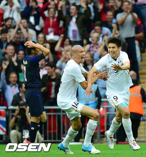 8일(한국시간) 새벽 영국 런던 웸블리 스타디움에서 열린 ‘2012런던올림픽 남자축구’ 일본과 멕시코의 준결승 후반 멕시코 페랄타가 역전골에 성공하고 있다.
