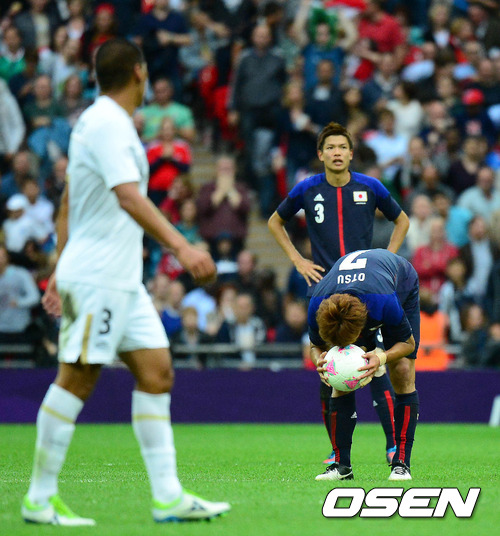 8일(한국시간) 새벽 영국 런던 웸블리 스타디움에서 열린 ‘2012런던올림픽 남자축구’ 일본과 멕시코의 준결승 후반 멕시코 페랄타가 역전골을 내주자 일본 오쓰가 공을 가져가며 아쉬워하고 있다.
