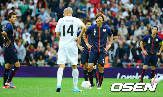 8일(한국시간) 새벽 영국 런던 웸블리 스타디움에서 열린 ‘2012런던올림픽 남자축구’ 일본과 멕시코의 준결승 후반 멕시코 페랄타가 역전골에 성공하자 일본 선수들이 아쉬워하고 있다.