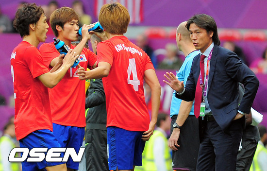 [OSEN=맨체스터(영국), 올림픽공동취재단] 8일(한국시간) 새벽 영국 런던 맨체스터 올드 트래포드 스타디움에서 열린 ‘2012런던올림픽 남자축구’ 대한민국과 브라질의 준결승 전반 홍명보 감독이 선수들에게 지시를 내리고 있다.