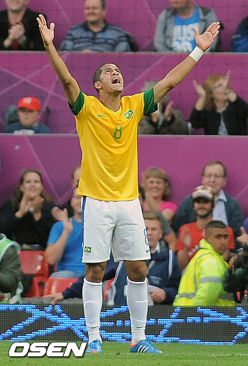 [OSEN=맨체스터(영국), 올림픽공동취재단] 8일(한국시간) 새벽 영국 런던 맨체스터 올드 트래포드 스타디움에서 열린 ‘2012런던올림픽 남자축구’ 대한민국과 브라질의 준결승 전반 브라질 호물루가 선제골에 성공한 후 기뻐하고 있다.