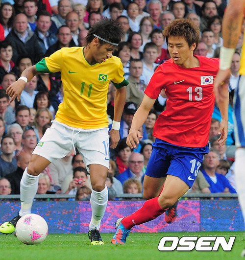 [OSEN=맨체스터(영국), 올림픽공동취재단] 8일(한국시간) 새벽 영국 런던 맨체스터 올드 트래포드 스타디움에서 열린 ‘2012런던올림픽 남자축구’ 대한민국과 브라질의 준결승 전반 브라질 네이마르의 볼을 구자철이 뺏으려 하고 있다.