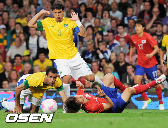 [맨체스터=AFP] 8일 올드 트라포트에서 열린 브라질과의 4강 경기에서 한국이 브라질에 3-0 으로 패하였다. 지동원 선수와 브라질의 티아고 실바(Thiago Silva) 선수의 모습. 2012. 8. 8. 2012. AFP / ANDREW YATES / News 1