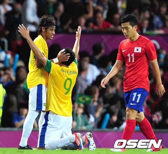 한국은 8일(한국시간) 새벽 영국 맨체스터에 위치한 올드 트래퍼드에서 열린 브라질과 2012런던올림픽 남자축구 4강전에서 0-3으로 완패, 결승 진출이 좌절됐다. 이로써 한국은 먼저 열린 경기에서 멕시코에 1-3으로 패한 일본과 3-4위전에서 맞붙게 됐다.