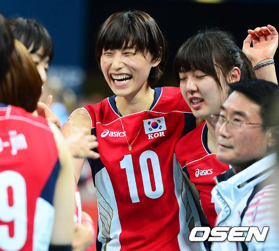 한국은 8일 새벽(한국시간) 영국 런던 얼스코트에서 열린 2012 런던올림픽 여자 배구 8강전에서 이탈리아에 세트 스코어 3-1(18-25, 25-21, 25-20, 25-18)로 극적인 역전승을 거두고 준결승에 진출했다.