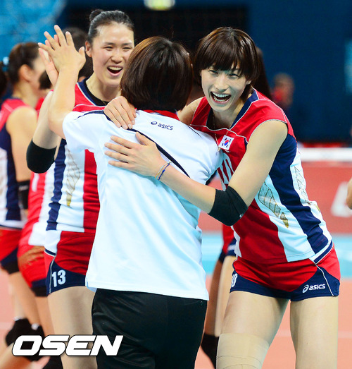 한국은 8일 새벽(한국시간) 영국 런던 얼스코트에서 열린 2012 런던올림픽 여자 배구 8강전에서 이탈리아에 세트 스코어 3-1(18-25, 25-21, 25-20, 25-18)로 극적인 역전승을 거두고 준결승에 진출했다.