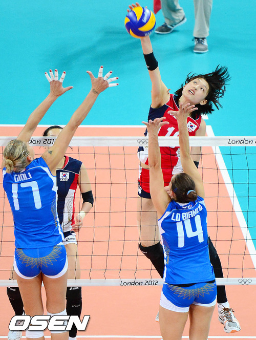 한국은 8일 새벽(한국시간) 영국 런던 얼스코트에서 열린 2012 런던올림픽 여자 배구 8강전에서 이탈리아에 세트 스코어 3-1(18-25, 25-21, 25-20, 25-18)로 극적인 역전승을 거두고 준결승에 진출했다.