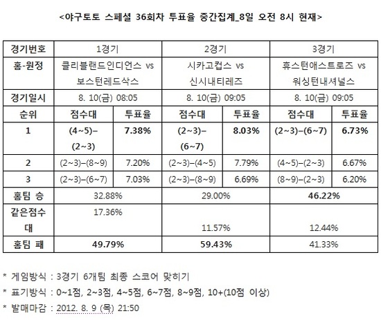 이번 야구토토 스페셜 36회차 게임은 9일 오후 9시 50분에 발매가 마감된다.