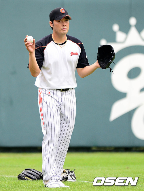 8일 오후 서울 잠실야구장에서 열린 '2012 팔도 프로야구' LG 트윈스와 롯데 자이언츠의 경기에 앞서 롯데 정대현이 훈련을 하고 있다.