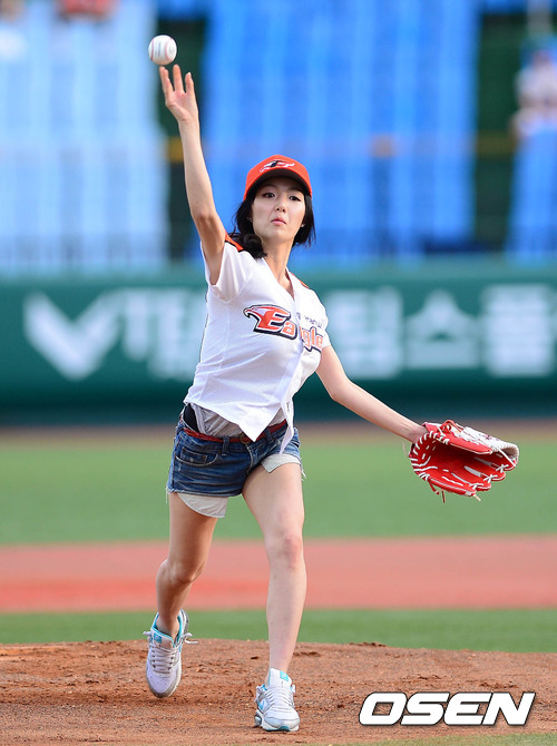 8일 오후 대전구장에서 열린 '2012 팔도 프로야구' 한화 이글스와 두산 베어스의 경기 시작 전 써니데이즈 정수정이 시구를 하고 있다.
