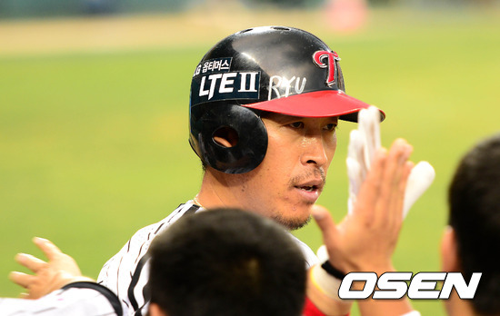 8일 오후 서울 잠실야구장에서 열린 '2012 팔도 프로야구' LG 트윈스와 롯데 자이언츠의 경기, 1회말 2사 LG 이병규가 중월 솔로홈런을 치고 더그아웃에서 동료들의 축하를 받고 있다.