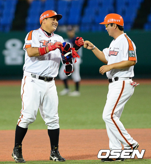 8일 오후 대전구장에서 열린 '2012 팔도 프로야구' 한화 이글스와 두산 베어스의 경기 4회말 무사 1루 김태균이 우익수 옆 2루타를 치고 이영우 코치와 하이파이브를 하고 있다.