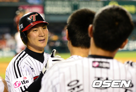 8일 오후 서울 잠실야구장에서 열린 '2012 팔도 프로야구' LG 트윈스와 롯데 자이언츠의 경기, 7회말 무사 LG 오지환이 좌월 솔로홈런을 치고 더그아웃에서 동료들의 축하를 받고 있다.