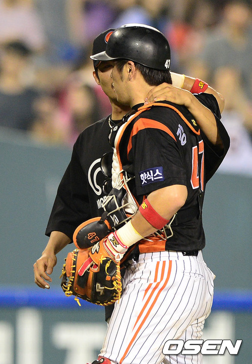 경기 종료 후 롯데 이용훈과 강민호가 이야기를 나누고 있다. / sunday@osen.co.kr