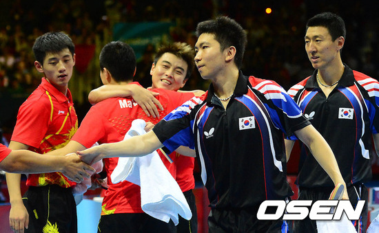 오상은(35, 세계 11위, 대우증권) 주세혁(32, 10위) 유승민(30, 17위, 이상 삼성생명)으로 이루어진 한국 남자 탁구 대표팀은 8일(이하 한국시간) 영국 런던에 위치한 엑셀 노스 아레나서 열린 '2012 런던 올림픽 탁구 남자 단체전' 중국과 결승전서 0-3(1-3 1-3 0-3)으로 패하며 은메달을 목에 걸었다.