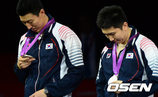 시상식에서 오상은과 유승민이 은메달을 바라보고 있다 /jpnews@osen.co.kr