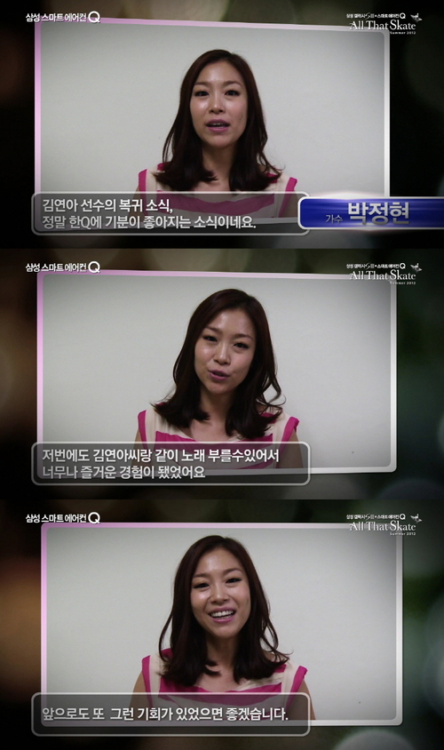 영상에서 박정현은 “선수 복귀라는 한 큐에 시원한 소식 너무너무 반가웠다”는 응원 메시지와 함께 “지난해 연아와 함께 평창 유치기원 음원을 부를 수 있어서 너무나 즐거웠다. 다시 한 번 같이 노래할 수 있는 기회가 있었으면 좋겠다”고 러브콜을 보냈다.