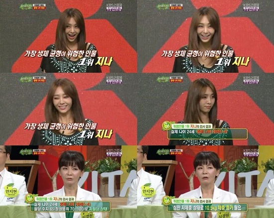 지나는 지난 8일 오후 방송된 KBS 2TV '비타민'에 '몸짱'으로 출연해 생체 나이 측정 검사를 했고 검사 결과, 지나는 10.5kg의 체중을 증가시켜야 한다는 결과를 받았다.