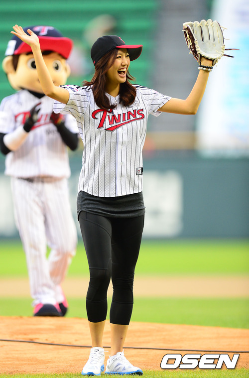 9일 서울 잠실구장에서 열린 '2012 팔도 프로야구' LG 트윈스와 롯데 자이언츠의 경기에서 2012년 미스코리아 선 김사라가 시구를 마치고 환하게 웃고 있다.