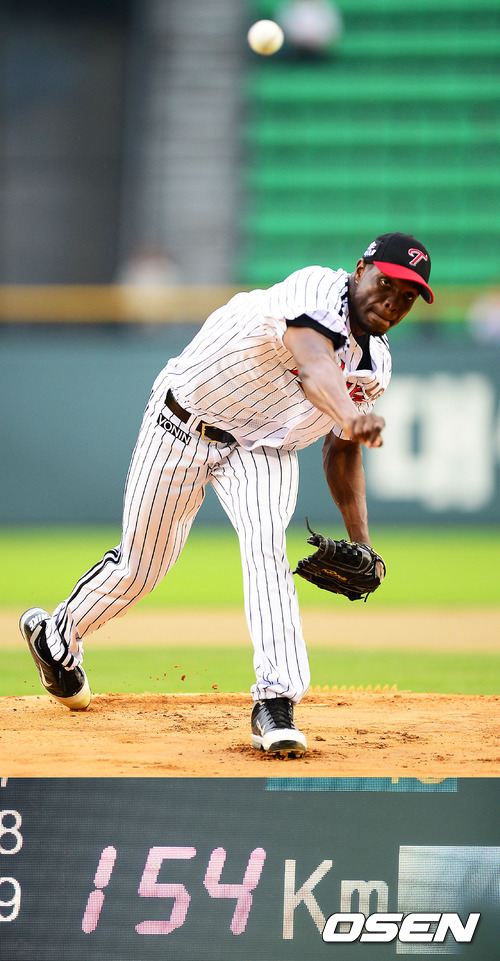 9일 서울 잠실구장에서 열린 '2012 팔도 프로야구' LG 트윈스와 롯데 자이언츠의 경기에서 LG 선발 리즈가 힘차게 공을 뿌리고 있다. 1회에 리즈는 154km 볼을 던지고 있다.