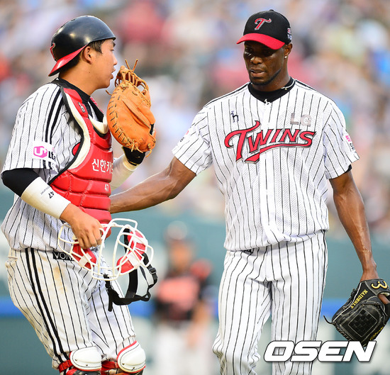 9일 서울 잠실구장에서 열린 '2012 팔도 프로야구' LG 트윈스와 롯데 자이언츠의 경기에서 1회를 마치고 리즈가 조윤준 포수의 허리를 치고 있다.