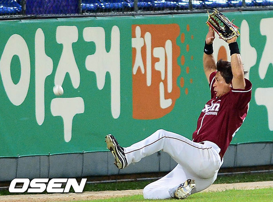 9일 오후 광주구장에서 열린 '2012 팔도 프로야구' KIA 타이거즈와 넥센 히어로즈의 경기 5회말 1사 1,2루 김원섭의 파울타구를 좌익수 송지만이 놓치고 있다.