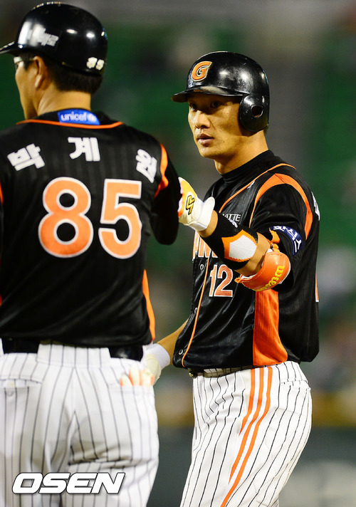 9일 서울 잠실구장에서 열린 '2012 팔도 프로야구' LG 트윈스와 롯데 자이언츠의 경기에서 5회초 2사 주자 1,2루 롯데 김주찬이 우익수 앞 1타점 적시타를 날린 후 1루에서 박계원 코치와 하이파이브를 하고 있다.