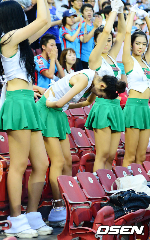 9일 서울 잠실구장에서 열린 '2012 팔도 프로야구' LG 트윈스와 롯데 자이언츠의 경기에서 롯데 치어리더 김연정이 응원 도중 고개를 숙여 고통스러워 하고 있다.