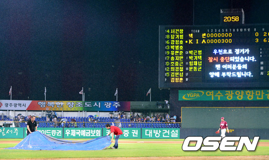 9일 오후 광주구장에서 열린 '2012 팔도 프로야구' KIA 타이거즈와 넥센 히어로즈의 경기 7회말 우천으로 경기가 중단되고 있다.