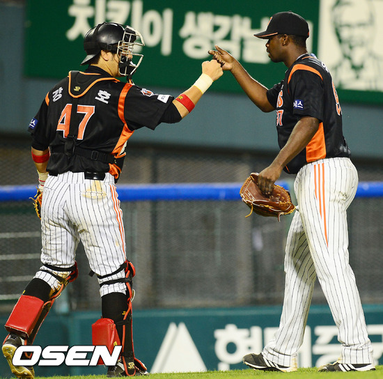 9일 서울 잠실구장에서 열린 '2012 팔도 프로야구' LG 트윈스와 롯데 자이언츠의 경기에서 8회를 마치고 롯데 강민호와 유먼이 하이파이브를 하고 있다.