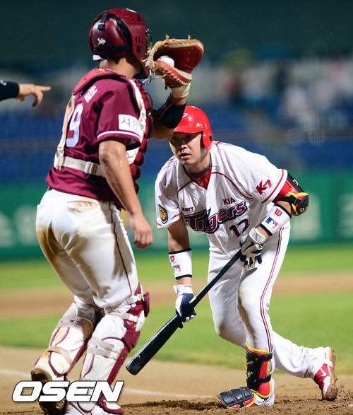 9일 오후 광주구장에서 열린 '2012 팔도 프로야구' KIA 타이거즈와 넥센 히어로즈의 경기 8회말 1사 1루 차일목이 삼진 아웃을 당하고 있다.