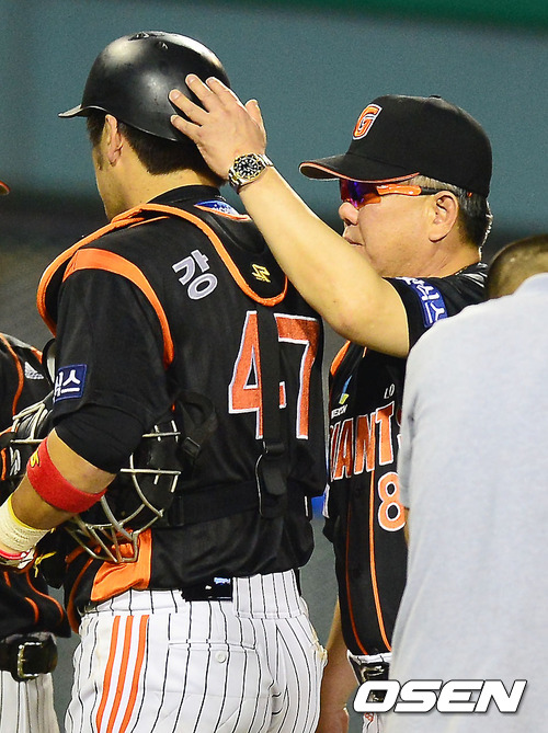 경기를 마치고 롯데 양승호 감독과 강민호의 머리를 쓰다듬고 있다. / rumi@osen.co.kr