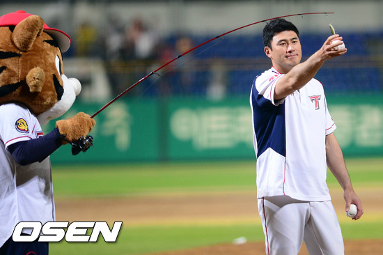 9일 오후 광주구장에서 열린 '2012 팔도 프로야구' KIA 타이거즈와 넥센 히어로즈의 경기 종료 후 서재응이 마스코트와 장난을 치고 있다.