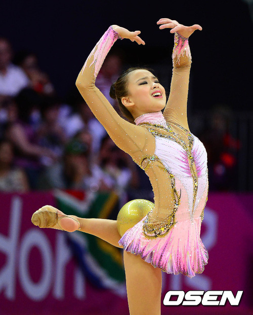 9일(한국시간) 영국 런던의 웸블리 아레나에서 열린 '2012 런던올림픽' 리듬체조 로테이션2에서 한국 손연재가 볼 연기를 펼치고 있다.
