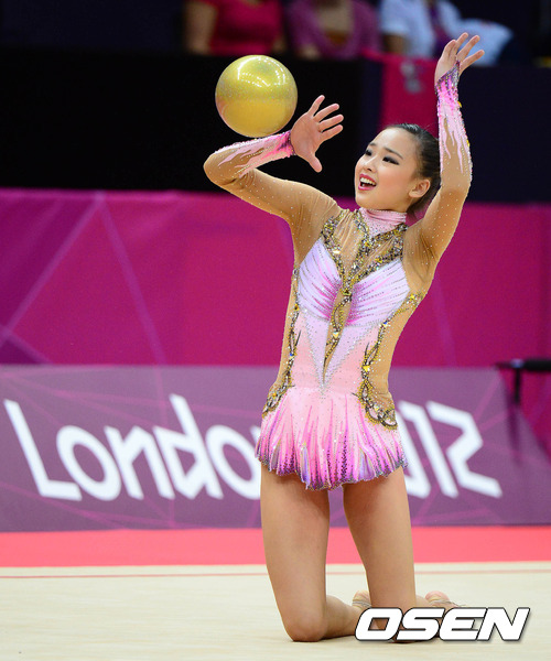 9일(한국시간) 영국 런던의 웸블리 아레나에서 열린 '2012 런던올림픽' 리듬체조 로테이션2에서 한국 손연재가 볼 연기를 펼치고 있다.