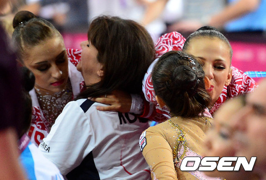 9일(한국시간) 영국 런던의 웸블리 아레나에서 열린 '2012 런던올림픽' 리듬체조 로테이션2에서 볼 연기를 마친 한국 손연재가 러시아 선수들과 인사를 나누고 있다.